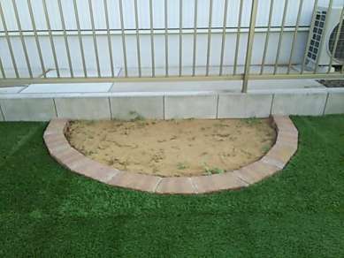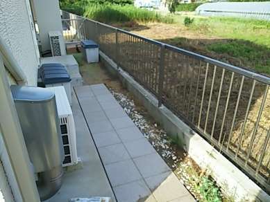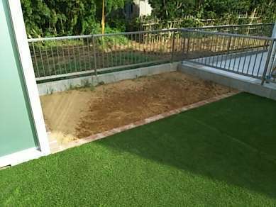 ウッドデッキ工事を行いました。 地面が土のため平板を敷いて束柱をたてました。 L字 手すり 外観左 段床