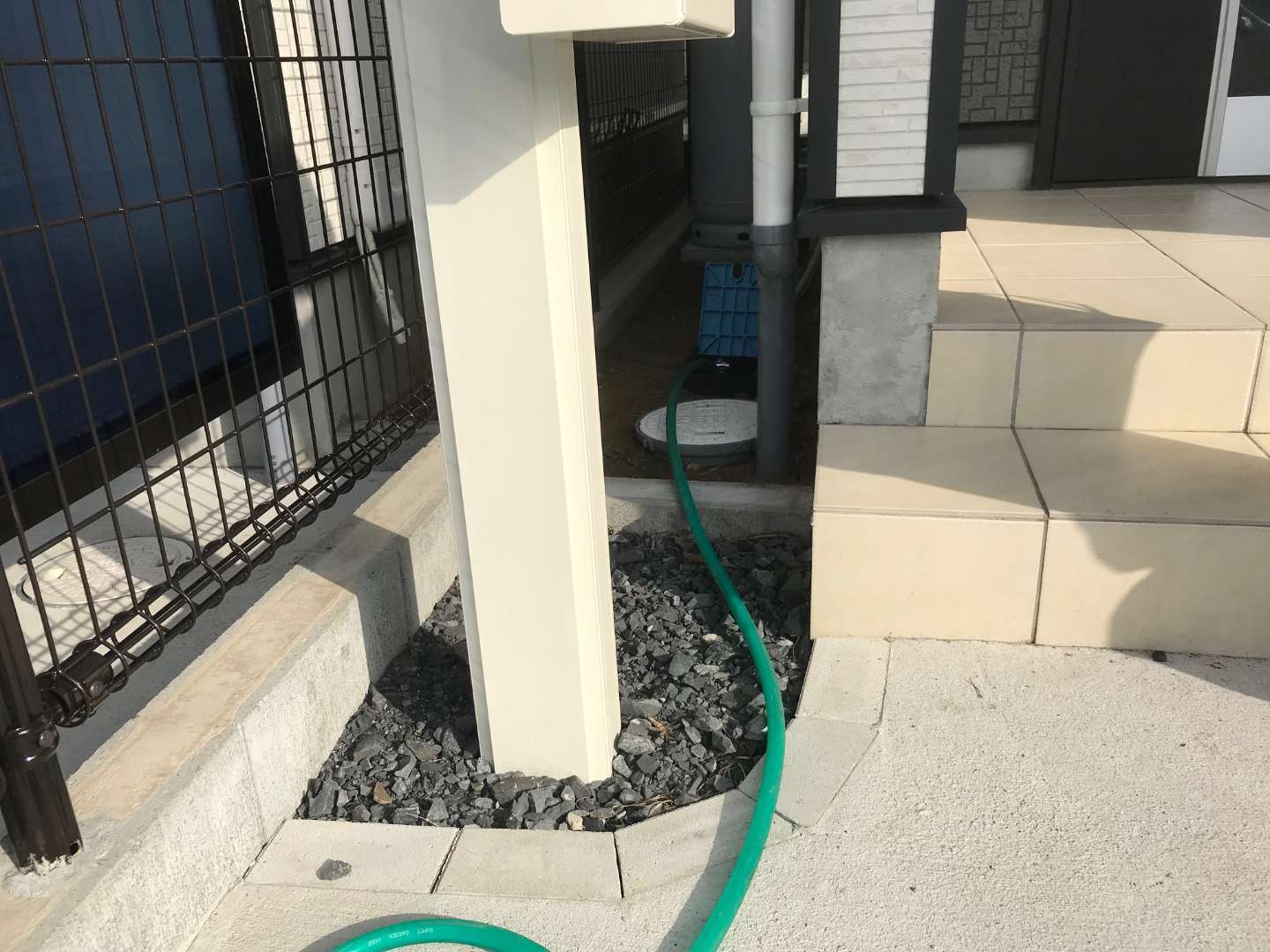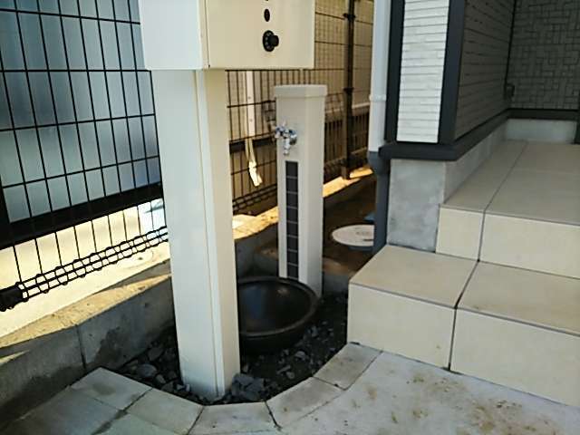 戸建て 立水栓工事 エクステリア工事 神栖市 立水栓工事 施工事例 神栖市にて立水栓工事を行いました。既存の散水栓はかがんで操作する必要があり、使い勝手が悪いとのことでご相談をいただきました。新たに立水栓とパンを設置し、排水は既存の桝へ接続することで、水はねや足元の汚れにも配慮しています。シンプルで建物外観にもなじむデザインの立水栓を採用し、日常の水やりやお掃除がしやすくなりました。メーカー:ユニソン商品名:ファミエンテ Before navigate_next After 場所 茨城県神栖市 前の施工事例 戸建て 【香取市】建物と調和するモダン外構|木目調フェンスとブラックカーポート 次の施工事例 戸建て 神栖市 物置工事 施工事例