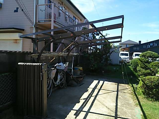 以前の台風の影響により、屋根の波板がすべて飛ばされて破損してしまったとのことでご相談をいただきました。お伺いした際は骨組みだけの状態でしたが、幸い支柱やフレームに大きな歪みはなかったため、波板の全面張り替えをご提案いたしました。