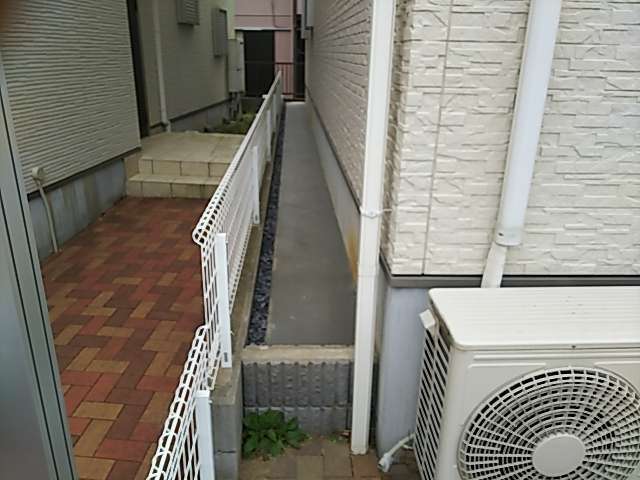 今回は、この通路を土間コンクリートで舗装することで、根本的な雑草対策を行いました。舗装にあたっては、すべての面をコンクリートで固めてしまうと雨水の逃げ道がなくなるため、境界部分にスリット状の砂利スペースを設けています。この「逃げ」を作ることで、雨の日でも水たまりができず、スムーズに地中へと水が浸透していくよう配慮しました。