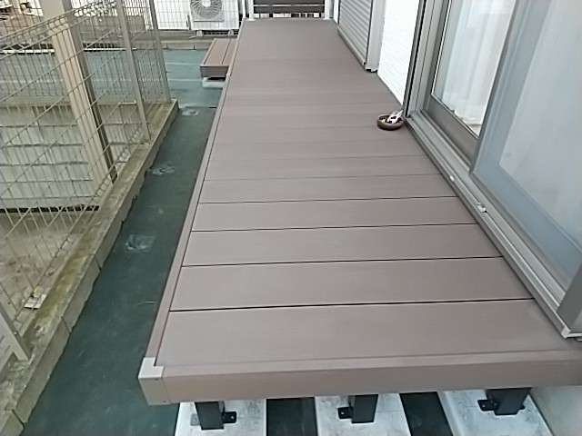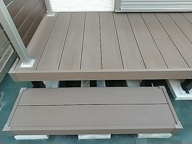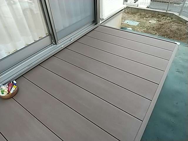 リビング前に出入りしやすいデッキスペースを設けたいとのご要望をいただき、住宅の外観に合わせたシンプルで使いやすい人工木ウッドデッキを設置しました。