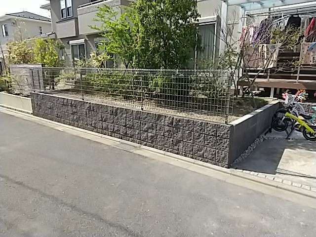 既存の道路際に設置されていたピンコロ石は撤去し、新たに化粧ブロックを積み増し、その上にメッシュフェンスを設置しました。