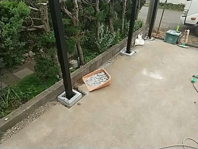 設置箇所の地面(コンクリート)に傾斜があったため、柱の長さを一本ずつ現場で調整。フェンス本体の天端(てっぺん)が水平に美しく揃うよう、細部までこだわって施工しています。